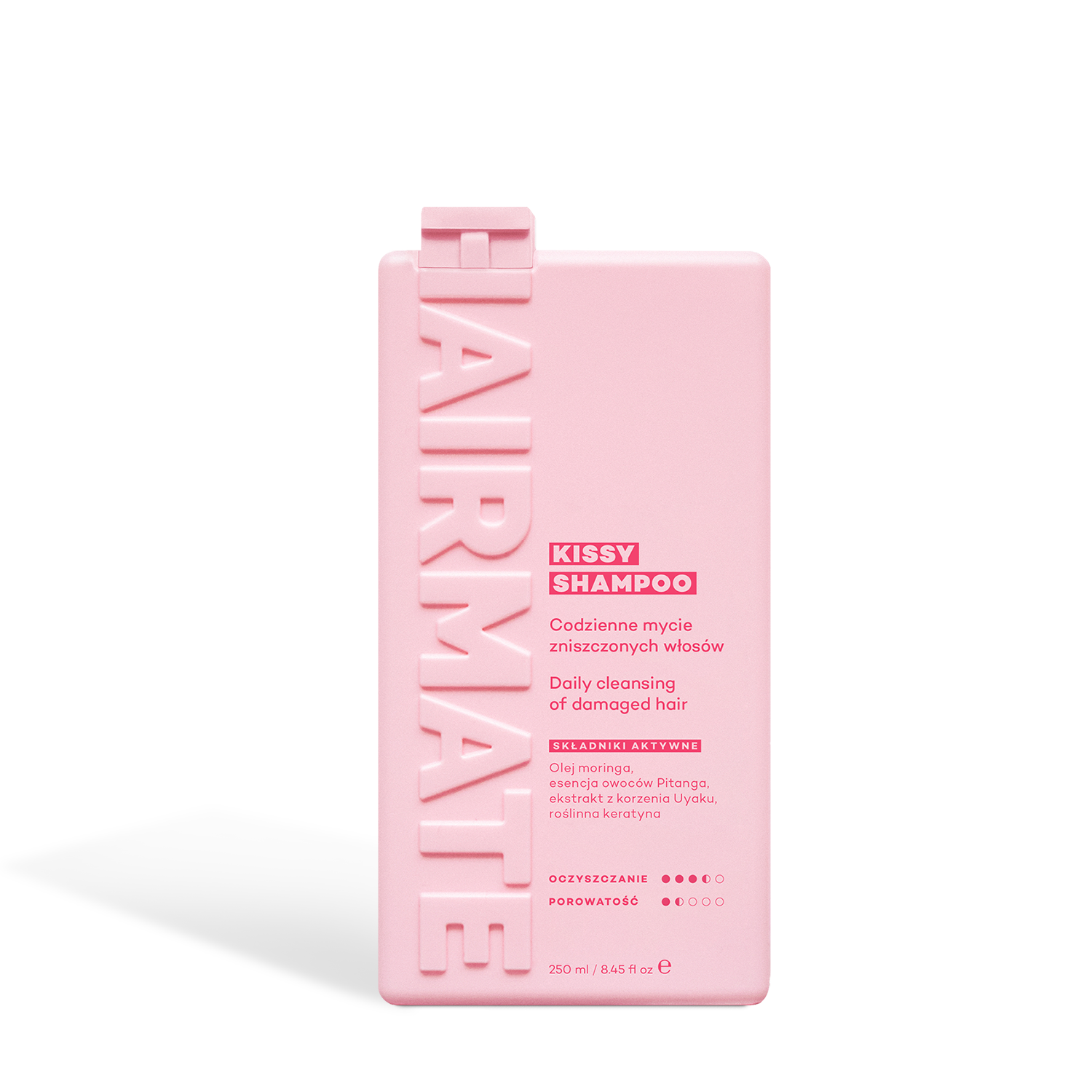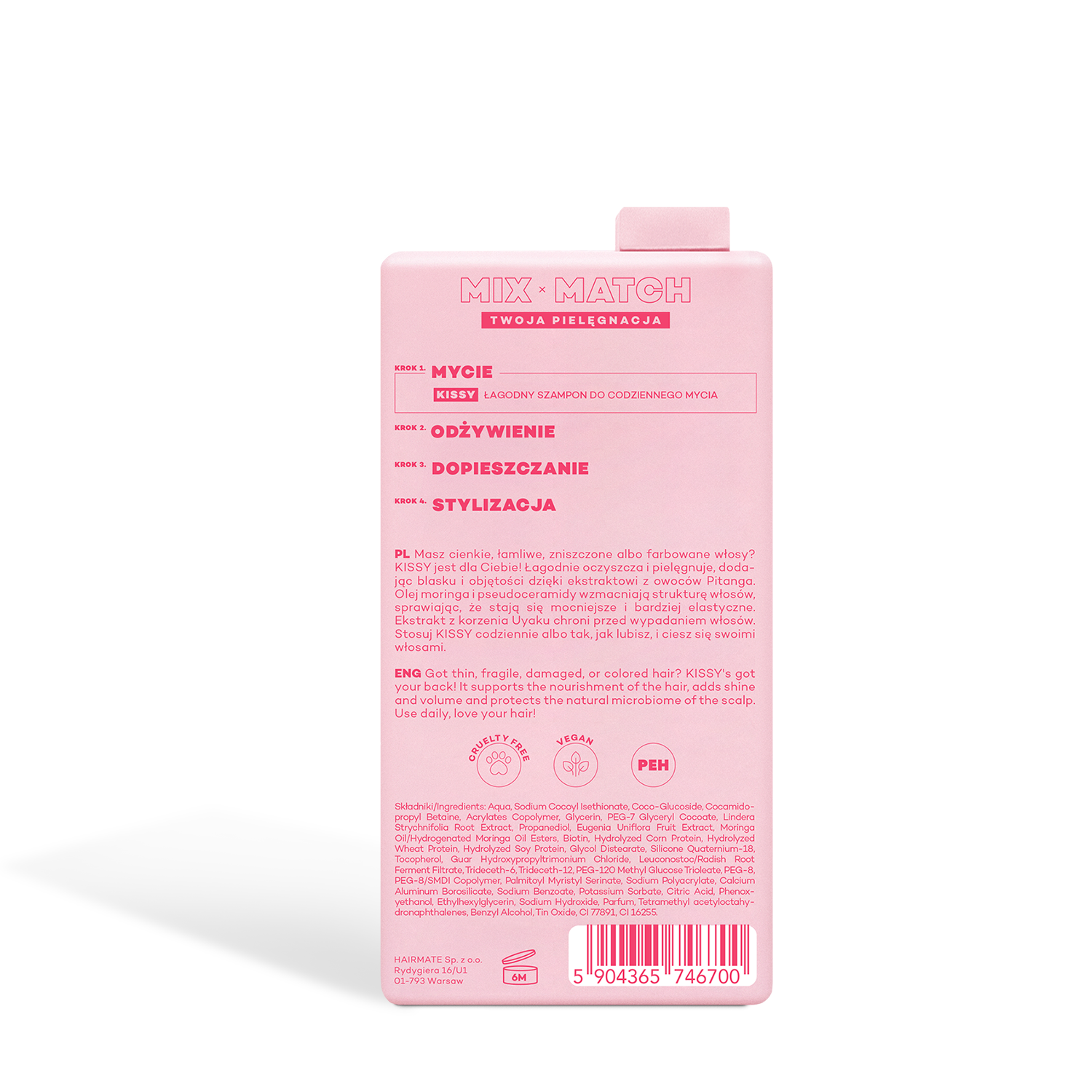 Masz cienkie, łamliwe, zniszczone albo farbowane włosy? KISSY jest dla Ciebie! Łagodnie oczyszcza i pielęgnuje, dodając blasku i objętości dzięki ekstraktowi z owoców Pitanga. Olej moringa i pseudoceramidy wzmacniają strukturę włosów, sprawiając, że stają się mocniejsze i bardziej elastyczne. Ekstrakt z korzenia Uyaku chroni przed wypadaniem włosów. Stosuj KISSY codziennie albo tak, jak lubisz, i ciesz się swoimi włosami.