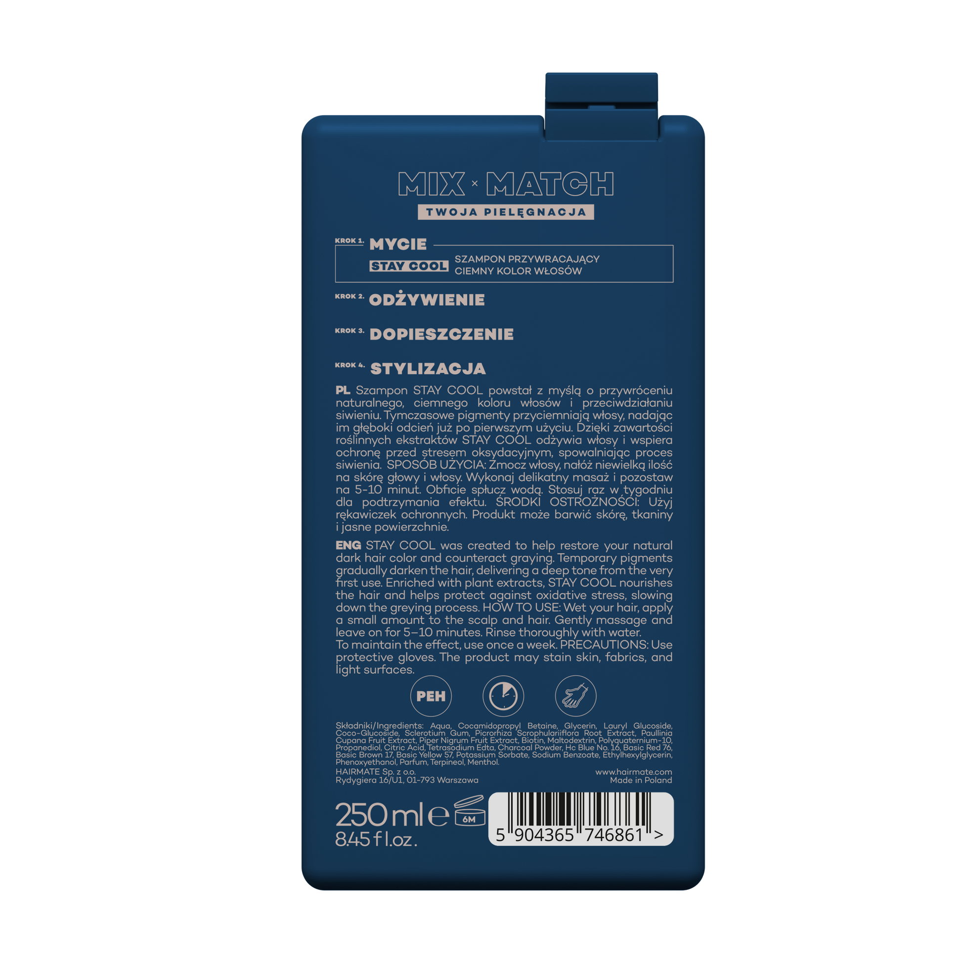 Stay cool shampoo został stworzony, aby przywrócić włosom ich naturalny, ciemny kolor i wizualnie spowolnić proces siwienia. Już po pierwszym użyciu tymczasowe pigmenty nadają kosmykom głębszy odcień, a ekstrakty z guarany, czarnego pieprzu i biotyna wzmacniają i odżywiają włosy. Dodatkowo formuła szamponu chroni włosy przed stresem oksydacyjnym, wspierając ich zdrowy wygląd.