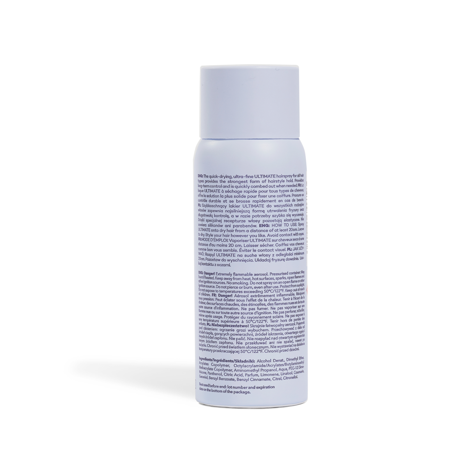 Lakier do włosów Ultimate skutecznie utrwala fryzurę a przy tym nie obciąża włosów. Nadaje się do każdego rodzaju włosów. To szybkoschnącą formuła o mocnym stopniu utrwalenia. Zapewnia kontrolę nad fryzurą, w razie potrzeby szybko się wyczesuje, a włosy pozostają elastyczne. Nie zawiera silikonów ani parabenów.